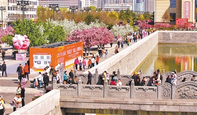 5月2日,在大同西城墙带状公园内,游客在海棠花海中徜徉。公园内还设置了人才招聘专区,游客纷纷驻足观看,在欣赏美景、感受生活的同时,也关注着城市发展带来的新机遇。 本报记者 张占兵摄