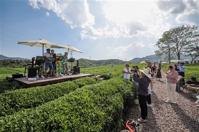 五月二日,游客在乾潭镇胥江村的茶园内欣赏露天舞台演出。
