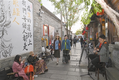 “五一”假期,大同古城游人络绎不绝,各种沉浸式演艺在街巷烟火气里裹着新潮劲儿,为游客送上美好体验。图为游客在吉他手演唱的民谣歌声中,体验古城的慢生活。