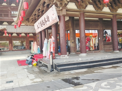 是日上午,华严广场仍有不少错峰出游的游客。广场周边有多家旅拍店,在“红了樱桃旅拍”店门前,一名女子在清洗旅拍服,水花四溅,周围满是积水。清洗完毕,该女子将满是泡沫的污水直接泼向广场,现场污水横流,和旁边干净整洁的地面形成鲜明对比。