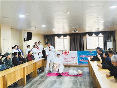 5月9日,平城区开源街道民华社区联合市三医院南丁格尔志愿者队开展 “守护生命,‘救’在身边”活动。本次活动旨在切实提升社区居民面对突发状况时的急救处置能力,为社区居民生命健康安全增添有力保障。图为医护人员讲解海姆立克急救法。
