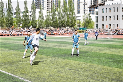5月13日,大同一中第七届校园足球班级联赛开幕。近年来,大同一中秉持“五育并举”教育理念,定期开展足球班级联赛,为学生搭建展示自我、锻炼能力的平台,让学生在激烈的体育竞技中感受足球魅力与激情。图为该校足球班级联赛现场。 本报记者 韩堃摄