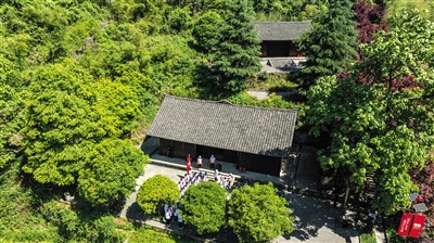 5月12日,云南省昭通市威信县第一中学组织开展一堂别开生面的思政课。200余名学生在红色研学实践基地亲手编织草鞋、制作蜡染,并参观了扎西会议旧址、红军长征过云南情景体验馆,在实践互动中重温红色革命历史。图为,威信县第一中学的学生在花房子会议会址参加红色研学活动(无人机照片)。