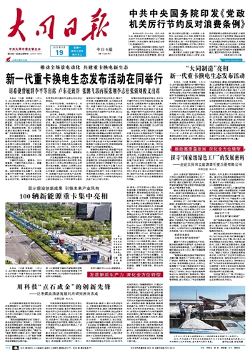 本报讯 (记者 张彩峰) 5月18日,由中国交通运输协会与宁德时代联合主办的新一代重卡换电生态发布活动在市美术馆举行,在会场外,由陕汽大同专用汽车有限公司生产的80辆身披“青碧铠甲”的底部换电重卡列阵以待、惊艳亮相,吸引了诸多参会嘉宾驻足询问。