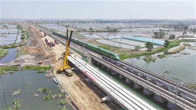 这是5月19日拍摄的沈山铁路鸭子河中桥新建大桥架梁工程施工现场(无人机照片)。