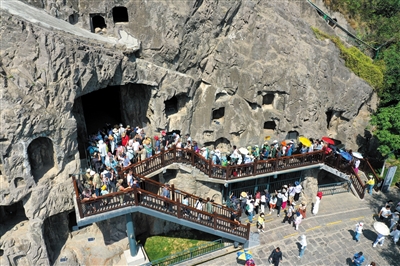 近年来,河南省洛阳市充分挖掘历史文化资源,以文塑旅,以旅彰文,不断打造文旅新业态与消费新场景,吸引八方游客前来感受古都洛阳的独特魅力。图为5月20日,游客在龙门石窟游玩(无人机照片)。 新华社记者 郝源摄