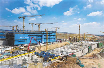这是5月21日拍摄的渝昆高铁长水机场站明挖区间顶板浇筑施工现场。左侧是正在建设的长水机场T2航站楼,未来将上跨明挖区间顶板。