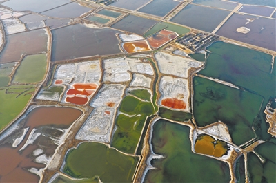 连日来,随着气温持续升高,位于山西南部的运城盐湖呈现出色彩斑斓的景象,从空中俯瞰,如同一块块散落在大地上的调色盘。 新华社记者 詹彦摄