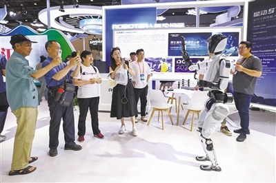 五月二十二日,观众在“数智中东欧”展区与人形机器人互动。