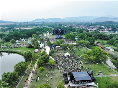5月24日,越位音乐节在杭州市余杭区径山镇径山花海景区举行(无人机照片)。音乐节期间,径山旅游度假区联动自然景观与人文资源,打造“昼游径山山水、夜赏花海音浪”的全时度假体验,吸引了大量青年群体的参与。