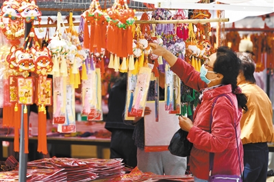端午节临近,大街小巷洋溢着浓浓的节日氛围。在东信小商品城,带有端午元素的五彩绳、手链、香囊等商品销售火爆,其中,粽子香囊、国风香囊等蕴含美好寓意的手工艺品更受欢迎。图为市民在挑选、试戴五彩绳、手链、香囊。