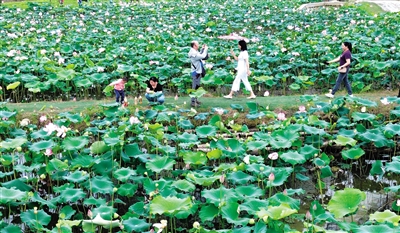 微风轻拂,鲜花绽放。人们走进大自然,拥抱初夏的美好,用运动和欢笑开启夏的活力乐章。图为,5月25日,游客在广西贺州市平桂区鹅塘镇栗木村一处乡间荷塘观赏荷花(无人机照片)。 新华社发 (廖祖平摄)