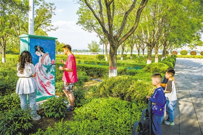近日,山西大同大学青年志愿者协会与该校美术学院青年志愿者协会组织70余名志愿者组成团队,利用周末时间对文瀛湖生态公园室外配电箱进行艺术化改造。志愿者们巧妙构思,将作品与周边景观融合,绘制出可爱动物、活力少年及经典卡通等形象。创作过程吸引了众多市民、游客围观,纷纷为创意点赞。图为正在作画的志愿者引来小朋友关注。