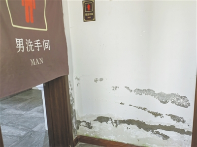 记者在两处公共卫生间看到,小便池明显长时间未清洁且地面均有不同程度污渍,洗手台上水渍斑斑,厕所门把手等处没有清洁,个别厕位暂停使用,内墙墙皮掉落、插座盒损坏、小广告无人清理等问题突出。