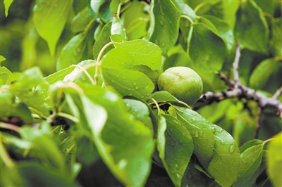 驱车不到10分钟便来到了李峪村。李峪村是浑源县特有的小气候果林基地,杏林以一条小溪为界,东边的果园俗称“东湾”,杏林吸收着山泉之水的甘甜;西边的林地内,林木以井水灌溉,长势更加喜人。由于杏树吸收水分不同,东湾的桃接杏和李峪村中耕地种植的桃接杏口感不同。东湾桃接杏大而甜,村中的桃接杏水份足。微风吹过,满身葱绿的杏树随风摇曳,翠绿的杏子展露叶间,看得人口中生津。