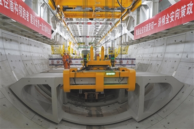5月29日,中铁十四局技术人员在甬舟铁路金塘海底隧道“甬舟号”盾构机内操作箱涵吊机拼装弧形构件。