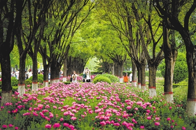 连日来,在文瀛湖畔太阳广场北侧,红、粉、白、紫等各色芍药花竞相绽放,美不胜收。据悉,文瀛湖生态公园内芍药花种植面积约8000平方米,端午假期,正值第四届“芍药节”在这里举办,众多市民、游客纷至沓来,漫步花海间,赏景休闲、拍照留影,尽情享受假日美好时光与繁花盛景。图为6月1日,市民、游客在芍药花丛中拍照留念。