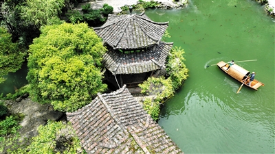世界环境日将至,各地开展多样活动,倡导社会公众积极行动,投身美丽中国建设。图为,6月4日,重庆市酉阳土家族苗族自治县桃花源景区,工人对景点进行水域保洁(无人机照片)。