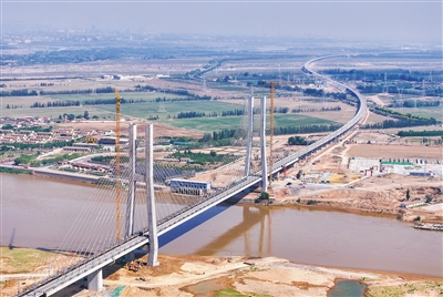 这是6月6日拍摄的已完成铺轨的包银高铁乌海黄河特大桥(无人机照片)。