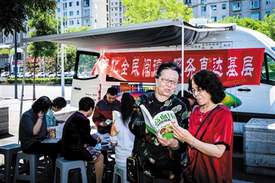 本报讯 (记者 王春艳) 6月6日,平城区图书馆在北魏明堂遗址公园南门开展“流动图书车”服务。