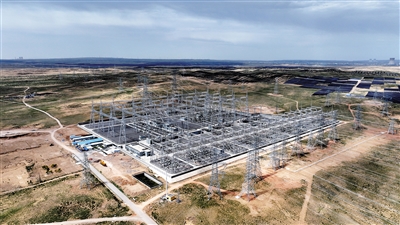6月8日拍摄的宁国运灵武100万千瓦光伏复合项目330千伏输变电工程线路终点——北地750千伏变电站(无人机照片)。
