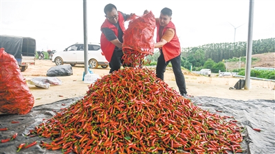 6月12日,在钦州市钦南区沙埠镇油埠村,两名志愿者在堆放农民收获的辣椒。
