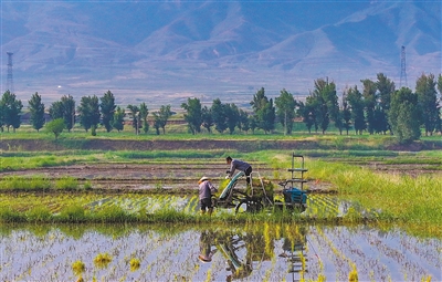 6月13日,在云州区吉家庄乡吉家庄村水稻田里,农民正在种植水稻。吉家庄乡位于桑干河南岸,全乡8个行政村有1万多亩沿河滩地,因盐碱化程度严重一直无法耕种。近几年,该乡利用境内有山有水、土壤富硒这一独特的资源禀赋,从东北地区引进了蟹稻种养技术,种植了具有抗旱、抗涝、抗盐碱的水稻品种,同时在稻田里套养鱼虾、螃蟹,让原来不能耕种的盐碱河滩变成亩产值7500元的生态良田,既增强了村集体经济发展能力,又带动了农民持续增收。