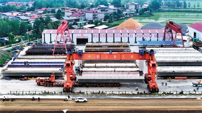 六月二十一日,在潍宿高铁中铁上海局郯城制梁场,提梁机在提运箱梁(无人机照片)。