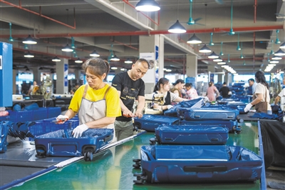 6月23日,在蓝山县皮具箱包科技产业园一家箱包生产企业,工人在赶制拉杆行李箱。