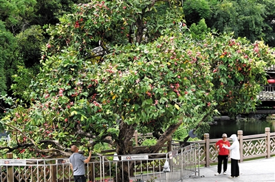 眼下,广西南宁市种植在城市道路两边的不少果树陆续结果。据介绍,南宁市中心城区部分道路旁种植了多种果树,每逢挂果时节,路树枝头累累硕果成为一道独特的城市景观。