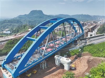 当日,由中铁四局承建的西渝高铁跨营达高速公路大桥主体平稳落在桥墩上,标志着全国首座高铁大跨度网状吊杆系杆拱桥顶推施工完成,为全线按期通车奠定了坚实基础。
