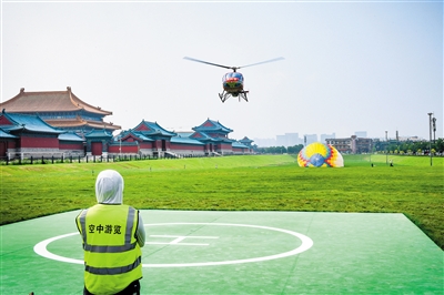 本报讯 (记者 史涌涛) 伴随着直升飞机轰鸣而起,地面的草坪也在螺旋桨的高速旋转下欢欣舞动,在大同古城内漫游的游客纷纷仰头观看,而另一侧的热气球也腾空欲飞,碧草如茵的偌大草坪与典雅的古城风貌交映成景。7月12日,大同古城低空旅游项目全新启动,为四海宾朋开启新视界。