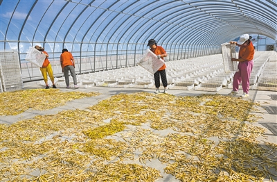 7月16日,云州区大同花倾城田间农业发展有限公司内,工作人员正在晾晒黄花。