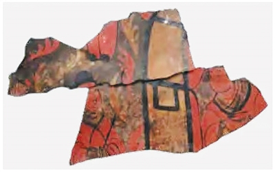 与新拼对部分残片,其画面应是草地上的白色帐子侧面开小窗,内挂红色帐幔,帐内一红衣人双手捧碗面向帐外,帐外人袖手执杆,二人额头点妆靥,应是女性。