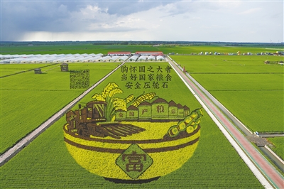 这是7月17日在富锦市万亩水稻公园拍摄的稻田画。