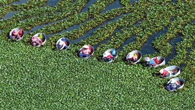 7月21日,江苏省淮安市洪泽区岔河镇农民在采摘菱角(无人机照片)。