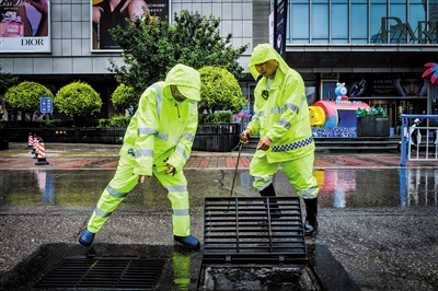 7月26日,气象部门预警的强降水来袭,市城市管理局工作人员依令奔赴易积水点排涝。记者在永泰南路百盛商场门前看到,市城市管理局工作人员撬井盖、设防护、开泵车,确保车辆和行人的安全及排水口畅通。图为工作人员查看排水渠排水情况。