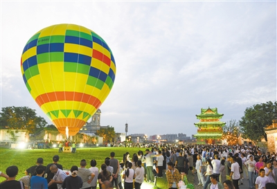 夜幕降临,大同古城东南邑、鼓楼东西街等街区灯火辉煌,吸引着来自五湖四海的游客。今年暑期,我市通过丰富夜间旅游产品与服务供给,让游客在光影交错间,沉浸式感受这座古城的历史底蕴与现代活力,夜游正逐渐成为展现大同文化特色的新名片。图为古城东南邑西北侧升起色彩斑斓的热气球。 本报记者 戎禹仁摄