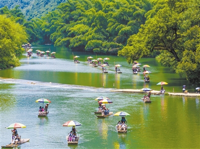 7月31日,人们在广西桂林市阳朔县遇龙河乘坐竹筏漂流(无人机照片)。