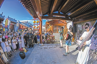 8月16日,市民、游客在平城区小石子村景区观看演出。