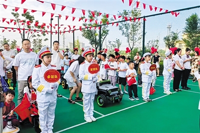 8月16日上午,枫林逸景·亲河园网球场变身红色海洋,萌娃队列表演活动在此欢乐举行。孩子们或骑着扭扭车、脚踏车,或迈着整齐步伐,化身“小小兵”精神抖擞地通过“检阅区”。稚嫩而认真的表演展现出满满的仪式感,引得现场家长纷纷举起手机记录精彩瞬间。