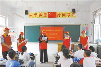 近日,国网天镇县供电公司“太行黎明”共产党员服务队和青年突击队队员走进谷大屯中心学校留守儿童之家,开展“用电安全进校园 爱心护航助成长”“开学第一课”系列活动,用爱心与专业知识为学生们送去别样开学礼物。活动中,队员们还为孩子们送上精心准备的书包、笔记本、文具等爱心礼品。图为队员们与学生们进行“用电安全问答”互动游戏。 张华摄