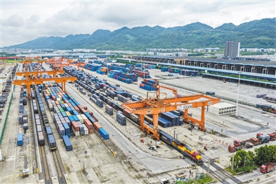 9月8日,满载“重庆造”汽车的中欧班列(成渝)在重庆团结村中心站等待发车(无人机照片)。