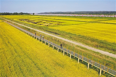 9月9日,游客在准格尔旗大路镇小滩子村黄河稻渔生态观光园游玩(无人机照片)。