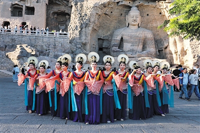 下午3时,秋阳正好。云冈石窟第5、6窟前的山门广场迎来了一场空前的艺术盛宴——中国农业大学教职工舞蹈队在这里进行了云冈乐舞专题展演。这场展演由北京大学云冈舞公众教育与艺术实践项目负责人田晴老师倾情指导。云冈研究院相关负责人说,为了这一刻,田晴老师多次往返北京与大同之间,反复进入洞窟揣摩造像神态,系统梳理云冈艺术源流,并亲自示范如何将静止的壁画形象转化为流动的舞蹈语言。她曾说:“我们要做的不是简单模仿,而是读懂它们背后的呼吸。”