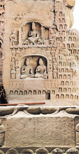 (二)小龛中的弥勒菩萨。昙曜五窟的洞窟壁面上散布的早期弥勒龛像多位于窟内前立壁,位置隐蔽,偏于一隅,数量少,规模小,多数单独出现,未见明显的组合关系,“求生兜率,得见慈氏”的弥勒信仰表现并不突出。