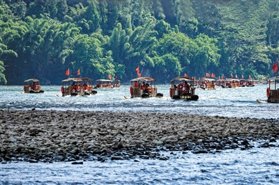 9月13日,在广西桂林市阳朔县兴坪镇,游人在漓江上乘坐竹筏赏景。
