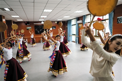 9月9日,在拉萨市第二中等职业技术学校,孩子们在练习热巴舞。