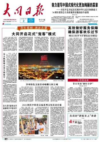 当晚,随着指令下达,密集的光点集群腾空而起,瞬间点亮古城夜色,9月30日晚的试飞预热早已让观众充满期待,现场的欢呼声即刻响彻街巷。光影流转间,熟悉的经典图景以全新姿态登场:云冈石窟的庄严佛像以立体形态悬浮,衣袂飘动的细节比暑期表演更显灵动;马背上的花木兰持剑而立,飒爽英姿掠过夜空;配合国庆节主题,鲜艳的五星红旗在天幕展开,“祝福伟大祖国繁荣昌盛国泰民安”的光影字幕与国旗交相辉映,现场瞬间响起热烈掌声,不少观众自发念出字幕,家国情怀在璀璨光影中愈发浓烈。