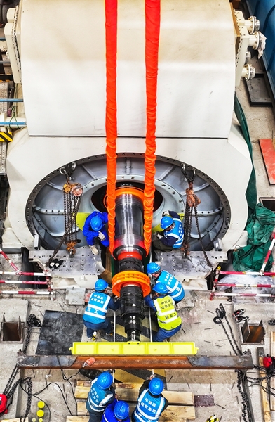此次穿装的转子由东方电气集团制造,采用“水—氢—氢”冷却技术,长15.04米、重96.6吨,对作业精度要求极高。作业中,工作人员采用“双行车协同吊装+电动葫芦精准推进”工艺,全程监测关键参数,历经5小时连续作业,转子平稳穿入定子,各项指标均符合标准。